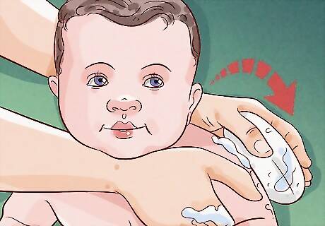 Expose and wash small areas, keeping your baby wrapped. Wash your baby’s body from top to bottom, working in small sections. When you’re ready to wash an area, uncover it and wipe it down with a soapy rag. Make soft, gentle strokes as you clean each area. Rinse the rag, then wipe down the area again to remove the soap. Finally, cover that area up and move to the next spot. Your baby can become very cold during a bath, so don’t leave their skin exposed for too long.