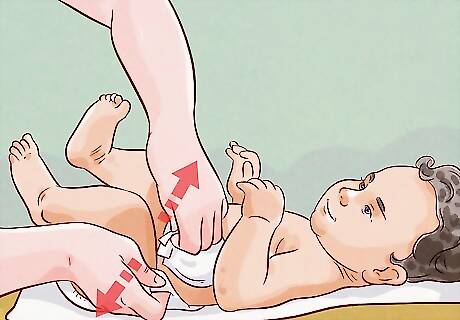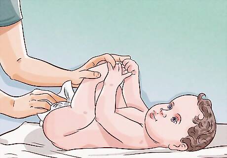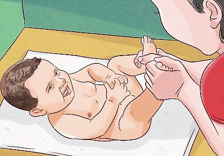 Wash your baby’s diaper area last because it's the dirtiest. The diaper area likely contains germs from your baby's poop, as well as possible dried-on waste. For this reason, it's extra important to give this area a thorough cleaning. Use your washcloth to wipe around your baby’s leg creases, genital area, and bottom. Make sure you don’t leave any dried on fecal matter, which can sometimes get trapped. When you’re washing the genital area, use these guidelines: For girls, wipe their vaginal area from front to back. For an uncircumcised boy, don’t push his foreskin back to clean his penis. Gently clean around the area without moving the foreskin. For a circumcised boy, don’t clean the penis for 3 to 4 days after the circumcision. After that, squeeze a thin stream of warm water directly onto your baby’s penis to clean it. Don’t apply any soap unless your doctor tells you to do so.