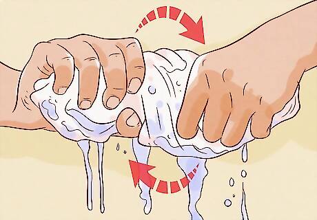 Wet your washcloth, then wring out the excess water. Dip the washcloth into the bin of water, then squeeze it in your hand to wring out the excess water. You want the washcloth to be damp, but not dripping. This allows you to clean your baby without getting the towel or blankets wet. Using too much water to bathe your baby can actually dry out their skin, so a damp rag is best.Tip: It’s best to use a washcloth that’s only used for washing your baby. Otherwise, make sure your rinse it well prior to your baby’s sponge bath so that there’s no soap residue from your regular soap.