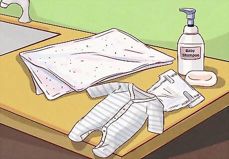 Set a towel, washcloth, baby shampoo, baby soap, diaper, and clothes nearby. Arrange all of the supplies you’ll need to wash your baby where you can easily reach them during the bath. Once you start washing your baby, you cannot leave to retrieve an item, so collect any supplies you think you may need. Baby shampoo and baby soap are optional, but you might decide to use them if you’re worried that water alone won’t get your baby clean. If you do decide to use them, choose a mild shampoo or soap that’s clearly labeled for use on babies.