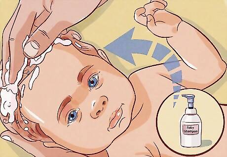 Use a wet washcloth to remove the shampoo from your baby’s hair. Use your damp washcloth to wipe away the shampoo. Make long, soft strokes that move away from your baby's face. Rinse and wring out the washcloth as needed as you clean away the shampoo. If necessary, you can squeeze a few drops of water over the baby’s scalp to help remove the shampoo, but make sure it doesn’t get on your baby’s face. Alternatively you can use a cup to pour clear water over their hair. Be careful that you don’t get the shampoo in your baby’s eyes. Use your hand to shield the babies eyes when rinsing their hair. Control the water and the shampoo suds with your washcloth.