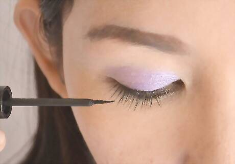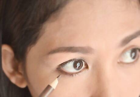 Start with eyeshadow this time. Use a dark shade- purple, blue, or black works best. Use a soft, small brush to contour. Sweep it below the browbone (just the lid) and extend into a cat-eye angle if you wish- but don't go to far, and make sure it goes upward, not downward. It'll make the person look sad if you do.