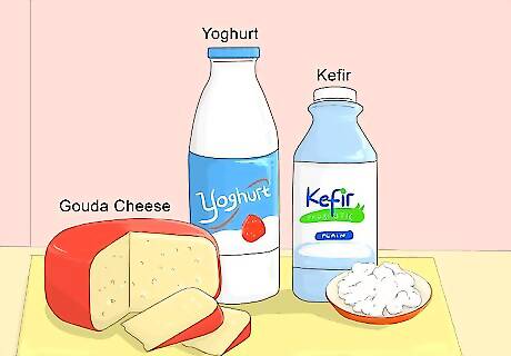 Feed them certain dairy products. Talk to your pediatrician about the best time to introduce dairy to your baby. Dairy products are one of the most common and popular sources of probiotics. Dairy products containing probiotics can found at most all supermarkets and in any region of the world. Look for products that have "Live and Active Culture" or "LAC" on the label. Some of the best dairy products that contain probiotics include: Kefir Yogurt Aged cheese like cheddar or gouda.
