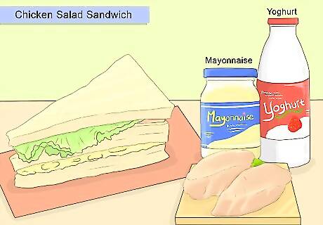 Make a chicken salad sandwich for your toddler. Chicken salad sandwiches, made with yogurt, are a great way for babies who are a year or older to eat solids that contain probiotics. To make a yogurt chicken salad sandwich: Dice or cut up chicken breast into very small pieces. Mix it with mayo, yogurt, and diced celery. Spread the chicken salad mixture onto a piece of bread.