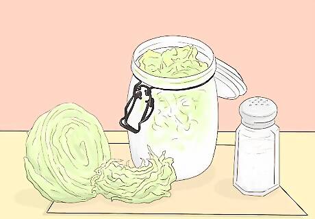 Serve your baby or toddler sauerkraut. Sauerkraut is another great dish rich in probiotics that you can serve to your baby. Ultimately, while sauerkraut may not be the most tempting treat for your baby, it is easy to make and can be served with a wide array of dishes. To make sauerkraut: Core and shred a medium cabbage. Add 2 tablespoons of salt. Place the mixture in a bowl and pound it with a meat hammer for 5 to 10 minutes. Dump the mixture into a jar and cover it. Keep the jar at room temperature for three days and then put it in the refrigerator. Serve the sauerkraut to your baby as a side dish.