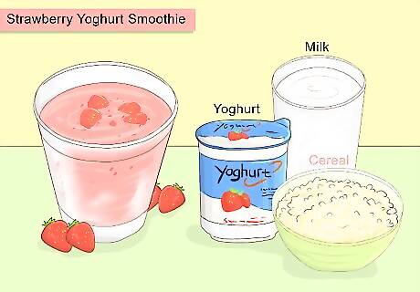 Create a strawberry yogurt smoothie. Strawberry smoothies are a fun and easy way to get babies older than six months to eat probiotics. Not only will your baby get the benefit of probiotics, but they'll enjoy it and you'll lay the foundation for healthy food habits in the future. To make a strawberry smoothie with probiotics: Pour ½ cup of milk, ½ cup of frozen berries of your choice, and ½ cup of yogurt into a blender. Blend for 2 to 3 minutes. Make sure the mixture does not become too watery. Place the smoothie into an age appropriate cup and sprinkle some cheerios or similar cereal on top.