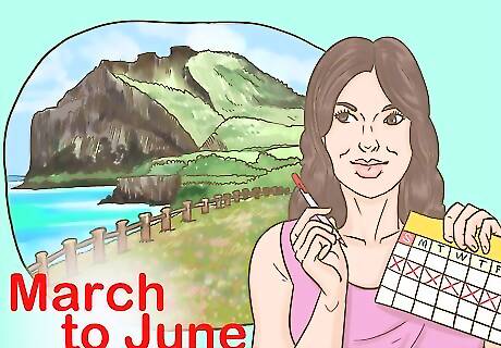 Visit Jeju Island in July to September if you plan to go to the beach. The highest temperature during this time will be 90 °F (32 °C). March to June are the most temperate months, with temperatures staying around 75 °F (24 °C), and this is when most of the flowers and vegetation will be in bloom. Even though the temperature is never extreme, there is still a good amount of rainfall on Jeju Island during the spring and summer, so make sure to pack a raincoat! If you want to visit in the fall and winter, be prepared for temperatures in the 40–50 °F (4–10 °C) range.