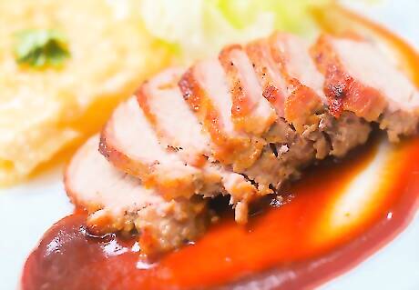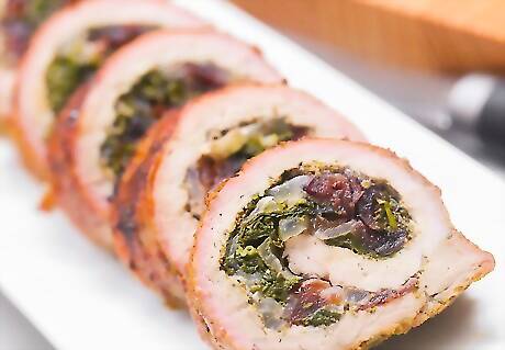 Tie up the stuffed tenderloin. Wrap a piece of cooking twine around the width of the meat to close up the cut. You don't have to get fancy, just take a few short pieces of twine and tie at least three times around the meat, one in the middle, and one at each end. If you don't have cooking twine, you can use some kebab skewers to pin the 2 sides of the meat together, pinching it closed. After the meat is cooked, remove the skewers and slice normally.