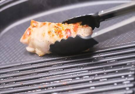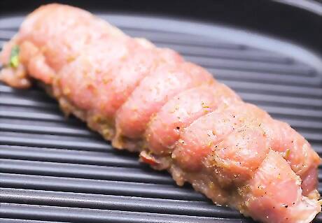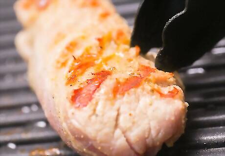 Grill normally. Follow the basic instructions for grilling a whole tenderloin, browning on all sides, then cooking at a cooler part of the grill for about 20 minutes. If you've got a particularly-messy stuffing, you might move the tenderloin onto a piece of tinfoil after moving it to the cooler part of the grill, to collect the mess. Take some care when you're testing the temperature of the meat, so you don't stick the reader into the stuffing, getting an inaccurate reading. The internal temperature of the meat, not the stuffing, should be between 140 and 155 degrees F (68 degrees C) according to a meat thermometer.