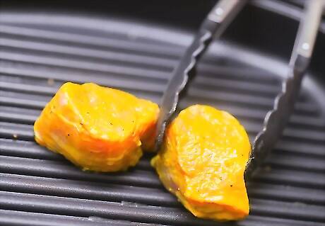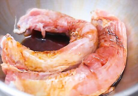 Consider marinading the meat before grilling it. Because tenderloin is such a lean meat, it's particularly amenable to marinades, rubs, and different seasoning combinations. Rub the meat with the marinade of your choice. This might include your own blend of spices or a ready-made marinade from the store. Store the meat in a covered bowl or in a zip-lock bag, then refrigerate overnight, or for at least 4 hours before grilling. Some good flavor combinations for pork tenderloin include: For classic sweet-sour pork marinade, mix a quarter-cup of olive oil, a clove of minced garlic, and a tablespoon each of brown mustard, soy sauce, brown sugar, with a teaspoon of red pepper flakes if desired. Vary the amounts to taste. Rub into the meat and refrigerate overnight, turning the meat periodically. For a spicy-sweet marinade, mix a cup of orange juice, a tablespoon of tomato paste and Dijon mustard, and a teaspoon each of garlic powder, chilli powder, white sugar, paprika, and Worcestershire sauce. Add a handful of chopped cilantro to the mix. For a sweet barbecue-style marinade, mix 2/3 cup of molasses and a half cup of brown sugar, a half teaspoon each of red pepper flakes, allspice, salt and pepper, then add 2–4 tablespoons (29.6–59.1 ml) of apple cider vinegar.