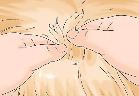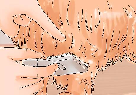 Untangle any knots and mats. Your dog may or may not have any knots or tangles in its fur. Dogs with longer hair are more likely to have mats or knots than shorthaired dogs. When you encounter a tangle, use the soft slicker brush to try to work the knot out. You can use your fingers to untangle knots as well. Mats happen when tangles become knotted together. You can use the soft slicker brush to untangle the mats. You may have to use clippers to cut out mats if you aren’t able to untangle them. Clippers are recommended over scissors – be very careful if you must use scissors, or you may cut the dog. Clip the mat out near the root. If the mat is very large, you may need to take your dog to the veterinarian or to a professional groomer to have it removed.