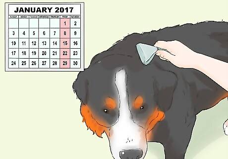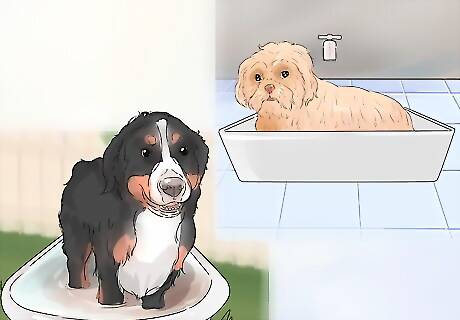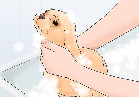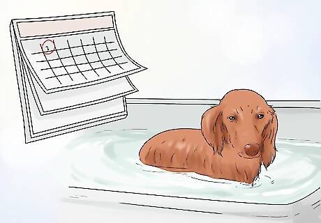 Bathe your dog once a month. Most dogs need to be bathed about once a month. They may need to be bathed more or less frequently depending on their breed and your veterinarian’s recommendations. Bathing too frequently can strip the skin of its natural oils and cause irritation. You will need to bathe your dog more frequently if it has rolled in something smelly or muddy.