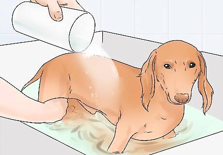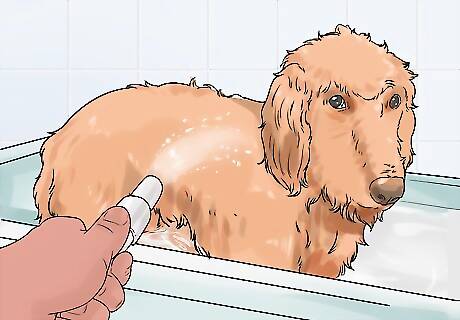 Wet your dog’s entire coat. Get your dog’s entire coat wet. Be careful to not get water directly in its eyes, nose, or ears. If your dog is prone to ear infections, try to keep water from entering the ear canals. Water that is trapped in the canal can cause an ear infection quickly.