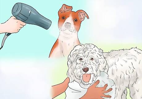 Dry your dog. You can use either a cotton towel or a blow dryer to dry your dog off after their bath. Some people swear by blow drying their dog’s coat, while others prefer to use towels. The choice is yours, but remember to use the blow dryer on a low or no heat setting if this is the option that you choose. If you use a towel, rub your dog’s fur gently. You do not want to pull the hair and create tangles by rubbing vigorously.