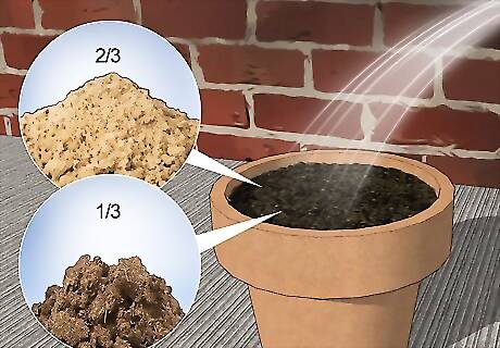 Fill a container with two-thirds coarse sand and one-third peat moss. Moisten this mix in the pot and place the cutting into it.
