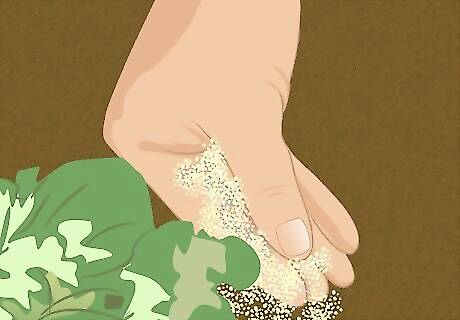 Use fertilizer that has a balanced 10-10-10 ratio. Apply the fertilizer about three weeks after planting. Sprinkle about 1/4 pound of fertilizer per 25 square feet on the soil around the kale plants. Do not get fertilizer on the plants as it could burn the leaves. If fertilizer does get on the plants by accident, wash them off right away with clear water from the garden hose. Ornamental kale plants that do not get fertilizer will grow more slowly and may not develop their bright colors.