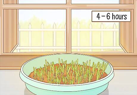 Move the tray to a brightly lit spot once green shoots appear. After 1 to 2 days, you should see tiny green shoots poking out from the growing medium. When that happens, remove and discard the plastic wrap, and place the tray by a window that gets at least 4 to 6 hours of sunlight. If you’re growing several trays of wheatgrass or don’t have a suitable window, you can also keep your seedlings under a 150-watt fluorescent lamp.