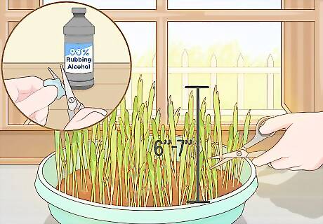 Harvest the grass when it’s about 6 to 7 in (15 to 18 cm) tall. The sprouts should be ready to clip about 8 to 10 days after planting. Cut them just above the level of the growing medium with a pair of sterilized scissors. To sterilize your scissors, wipe them with a paper towel soaked in 90% rubbing alcohol. Alternative, wipe them with a mixture of 10 parts water to 1 part bleach, then rinse away the bleach solution with hot water. Rinsing isn't necessary if you use the alcohol method. Sterilizing your scissors will help prevent disease and keep the wheatgrass healthy enough to grow back for a second clipping.