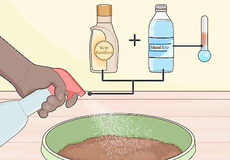 Moisten the growing medium with a mix of water and kelp fertilizer. Media such as coir and a mix of perlite and vermiculite aren't quite nutritious enough for wheatgrass, so adding fertilizer will help your plants thrive. Mix cool or lukewarm filtered water and liquid kelp fertilizer according to your product’s instructions, then spray the growing medium just enough to moisten it. Find liquid kelp fertilizer online or at a garden center. Mixing ratios vary, so check your product’s label for instructions and use it as directed. A general guideline is to use 1 fluid ounce (30 mL) of fertilizer per 1 gallon (3.8 L) of water. The growing medium should be damp, but not soggy. The sprouts will die if there’s standing water in the tray.
