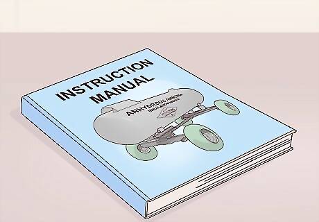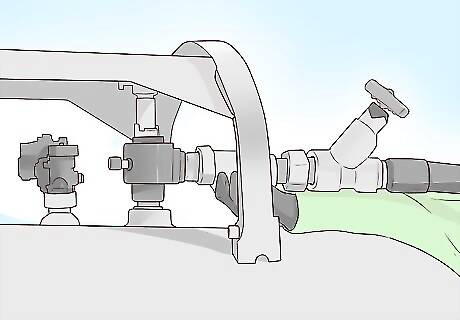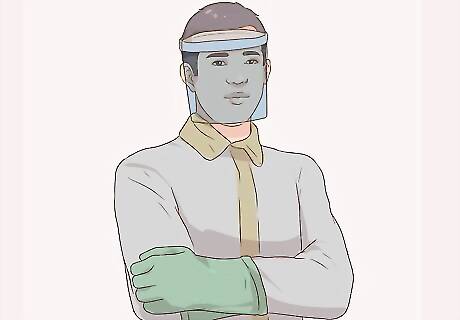 Wear protective gear. To protect yourself, wear a heavy-duty, long-sleeved shirt and long pants and/or coveralls, along with rubber gloves with an extended cuff that can be turned down to catch any of the liquid ammonia if it runs down your arms when they're raised. Cover your face with either chemical-proof goggles or a full-face respirator. Regular glasses are not a substitute for goggles, but if you wear normally wear contact lenses, wear your glasses under your goggles instead of your contacts when working with anhydrous ammonia. That way, should any ammonia seep into your eyes, you can flush them with water; contact lenses will trap the ammonia and damage your eyes before you can remove them.