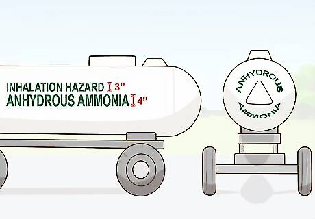 Paint tanks in light, reflective colors such as white or silver. This will reflect heat, helping to keep the tanks cooler and the pressure inside them lower. Label nurse tanks with "ANHYDROUS AMMONIA" in letters that are 4-inches (10-centimeters) high on the sides and rear of the tank, with the words "INHALATION HAZARD" in letters 3-inches (7.5-centimeters) high on either side.