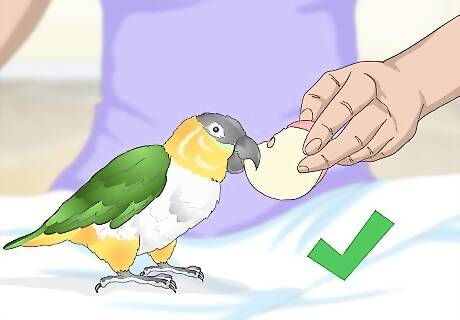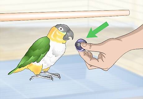 Reward your caique for behaving when being handled. It's important for a caique to think of handling as positive experience. This will prevent biting and other aggressive behaviors. Each time you handle your bird, reward it. Treats, praise, and time with toys will help your bird think of handling as a fun experience.