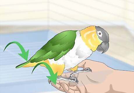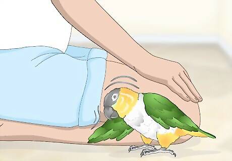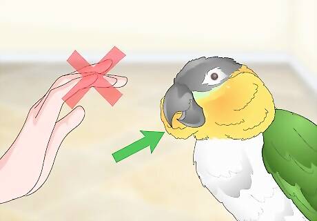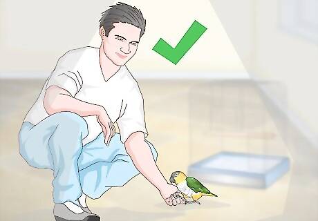 Remain calm when handling the bird. Caiques are highly intelligent birds that are very adept at picking up cues from their owners. If you handle your bird when you're stressed or upset, your bird will notice these emotions. Only approach a caique for handling when you're calm. If you feel scared, your bird will feel the same way and may become aggressive.