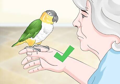 Let your parrot climb into your hand. After your parrot's comfortable being scratched and fed, hold your hand out to your parrot. Let your parrot climb onto your hand or perch on your fingers. Most parrots will eventually climb in your hand on their own after a few days or weeks. It's very important your parrot comes to you on its own terms so it doesn't feel threatened. Do not force a parrot into your hand. Let it make the decision to get onto your hand on its own.