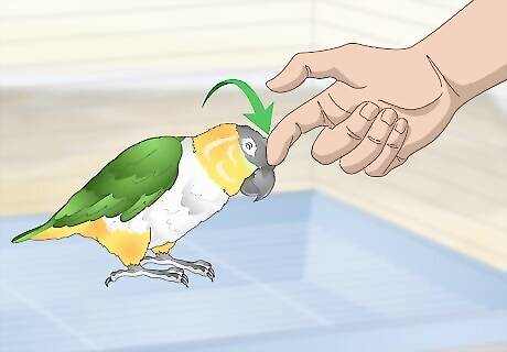 Scratch your parrot's head. After your parrot comfortably takes treats from you, scratch its head after presenting it with a treat. This will get your parrot used to your touch and teach it to associate handling with positive things. Avoid putting your hand over your bird's head when you scratch it. Instead, come up the side of your bird's head with your hand. Make sure to move your hands slowly when scratching your parrot and keep your hands visible. If you move too quickly, your parrot may perceive your hands as threatening and bite.