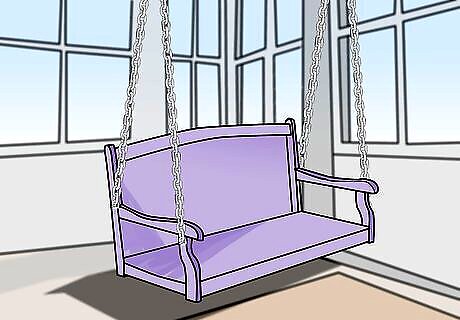 Hang the swing. Connect a rope or chain to the front swing hook, then loop it up through the corresponding eyebolt or screw-eye on your porch ceiling. Connect the end of your rope or chain to the second swing hook on the same side of the porch swing that you connected the other end of your rope or chain. For instance, if you’re facing your porch swing and attempting to hang it, connect a chain to the front-left swing hook, loop it through the eyebolt, then connect the end that passed through the eyebolt onto the swing hook located at the back-left of the swing porch. Repeat on the opposite side. If your porch swing is heavy, have a friend help you lift the porch swing up to the height at which you wish to hang it before attaching it to the ceiling.