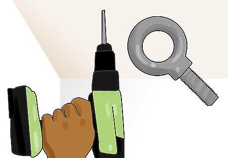 Use eyebolts in homes with finished ceilings. In homes with finished porch ceilings, you won’t be able to use a screw-eye. Instead, you’ll use an eyebolt. Cut away part of the roof above the porch swing to access the joists and beams that can support the eye-screw. Predrill a hole through the joist. The drill tip should come out straight through the ceiling of your porch. Slide a six-inch machine-threaded eyebolt up through the porch ceiling and have a friend on the other end (on the porch roof) secure it with a nut. Install another eyebolt in another joist or beam at a distance from the first that is roughly equivalent to the length of the porch swing. Repair the roof when finished. This technique is most common in older homes.