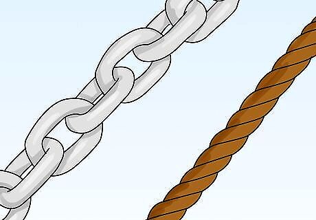 Choose between steel chains or rope. Chains of stainless or galvanized steel are the most common option. However, if you’d rather have a hanging porch swing with a more rustic look, you could use marine-grade braided nylon rope or polyester rope. Your ropes or chains will likely need to be at least seven feet long. If you use rope, ensure it is at least ¾’’ (19 millimeters) thick. Whatever you choose, ensure you obtain two equal lengths of each, one for each end of your porch swing. If you choose to hang your swing with rope, check it regularly for signs of wear like fraying threads.