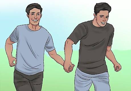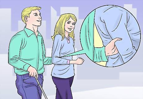 Practice running or jumping. This may sound odd, but learning varying movements can be a great help to a blind or visually impaired person. This is also a great way to build trust. Ask them to hold your hand and start off with a very slow jog. Practice on a soft surface in case you fall. Have them hold your waist as you jump so they can feel the up and down movement and copy it. The same method goes for more complex tasks, like jumping rope or even skipping.