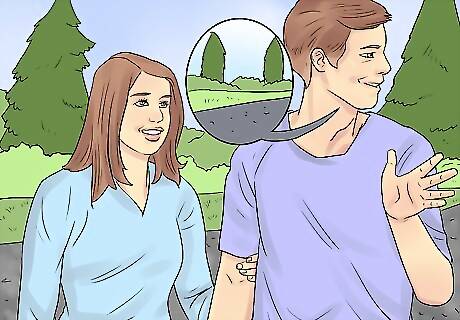 Describe the sights. As you are walking somewhere, feel free to chat about what you are seeing. Try to use descriptive, interesting, illustrative words. You might also describe where certain smells or noises are coming from in the context of the scene. You might say, “As you probably can feel, this road is really bumpy because there are big, black pot holes all over it.”
