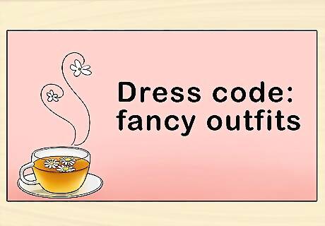 Include a note about a dress code, if desired. If you want your guests to dress up for the tea party in their finest fancy attire, specify this in the invitation. You may suggest that guests dress in party frocks, pearls, and fancy hats to get into the theme. Or you may recommend guests show up in “fancy outfits” and let them use their imaginations. For example, you may note in the invitation: “Dress in your fanciest frock, pearls, and pretty hats, if you desire. Dressing up is recommended, but of course, not mandatory.”