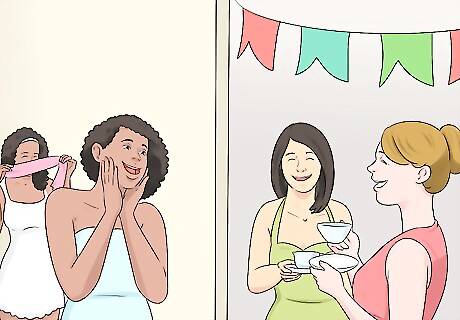 Surprise the bride when she arrives. Traditionally, bridal showers are a surprise for the bride. You may set up an elaborate surprise where the guests pop out and yell “surprise” as the bride arrives at the venue. Or you may simply have the bride arrive a few minutes later than everyone else and surprise her that way. Another option is to blindfold the bride and have her enter the venue. Then, remove the blindfold and surprise her with a drink as well as the company of her closest friends.