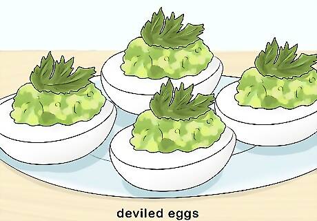 Prepare deviled eggs. Deviled eggs are another classic finger food for a tea party. Make classic deviled eggs or put a southern twist on them with pickles and pimento. You can also make bacon and guacamole deviled eggs or for a fancier option, deviled egg canapes.