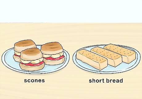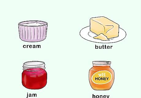 Include sides like clotted cream, jam, honey, and butter. Put out sides to accompany the scones and shortbread you are serving your guests. Go for locally sourced honey and jam. Bring the butter to room temperature or warm it up slightly so it is easy for your guests to spread.