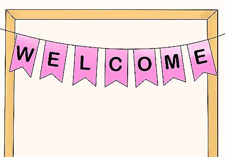Hang a welcome banner. Make a welcome banner out of fabric or paper to hang over the doorway or over the food and drinks table. You can even spell out the bride’s name on the banner. You can also buy a welcome banner for the party at your local craft store or online.