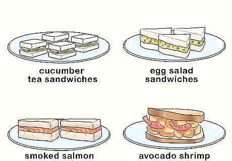 Make tea sandwiches. Tea sandwiches are a must at a tea party. Prepare cucumber tea sandwiches with cucumber, butter, and bread. You can also make egg salad sandwiches, smoked salmon sandwiches, and avocado shrimp sandwiches. Invite friends of bride over for a tea sandwich making session at your home the day before the party, or a few hours before the party. You can also hire a caterer to make the tea sandwiches for the party if you’d prefer.
