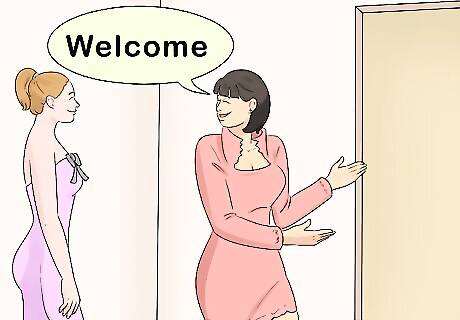 Greet guests as they arrive. Stand at the door and say “Hello” or “Welcome” to your guests as they arrive for the party. Guide them into the venue and direct them to the food and drinks table. Take your guests’ coats and other items, as needed. If your guests have brought gifts to the party, be sure to direct them to the gifts table.