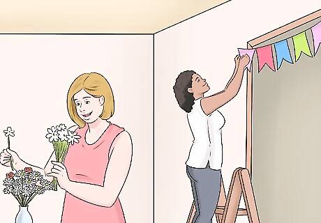 Decorate the venue beforehand. Ask friends or family members to help you set up the party the day before, or a few hours before. This way, you are not scrambling to decorate the venue and you can feel organized for when your guests arrive. You may designate tasks to different people to ensure the party is set up quickly and correctly. For example, you may have one person organize the fresh flower arrangements and another person set up the food and drinks table.