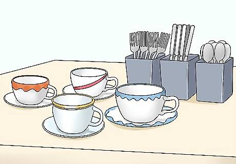 Have a variety of tea cups, saucers, and utensils. Mix and match tea cups for a more funky set up. Or have matching sets of tea cups and saucers for your guests to use. Make sure you include spoons, forks, and serving plates as well. Look for utensils made of silver or copper for a tea party look. You can also get serving plates that have floral designs for a more festive party feel.