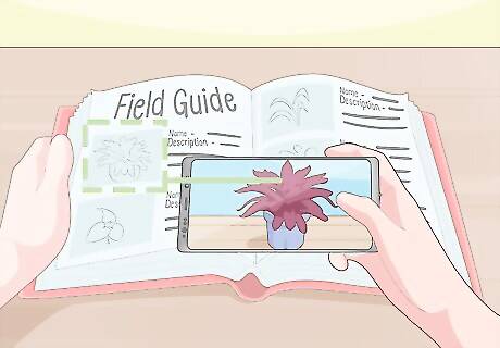 Use a field guide to identify houseplants and learn more about them. Field guides are books that provide the name, photograph, and description of common plants. Look for a field guide that’s dedicated to houseplants. Then, flip through the guide to find a plant that looks like the one you want to identify. Use your photos and notes about the plant to find a match. Don't forget to review the description to make sure it matches your notes. Check with your local library, nursery, or County Extension office for guides. You may be able to use one for free or for a small fee.