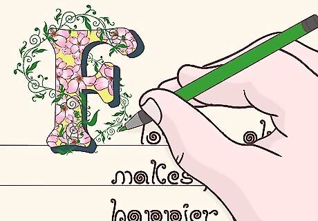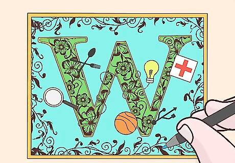 Take the first letter of a story. Use the first letter of a story you wrote, or one from your favorite book. Illuminate just the first letter on the first page, or one at the beginning of each chapter or section. Think of the characters, images, or scenes contained in the story or chapter to start planning how you'll decorate the first letter. Maybe animals, plants, landmarks, or weather will feature in your design. Or maybe you will only use abstract shapes and lines to illustrate the feeling of the story. Instead of drawing a character in the story, think of you how you could draw the interests of that character or components of their life for your letter decoration.