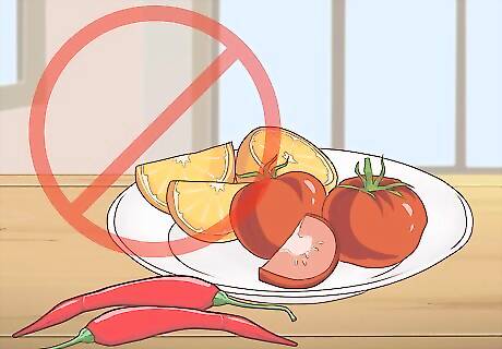 Avoid certain foods. Some foods may make your bladder problems worse. Certain foods may lead to increased incontinence. Try to reduce the amount of these foods to help. Spicy foods, such as spicy curries or foods that use hot peppers, are believed to cause bladder problems. Some acidic foods can worsen bladder problems. This includes tomatoes, tomato sauces, and acidic fruit like oranges, grapefruit, lemons, and limes. Other foods that may cause bladder problems include coffee, tea, chocolate, and other foods with caffeine, along with artificial sweeteners. This is most likely because components of these foods are excreted in the urine and can irritate the bladder.