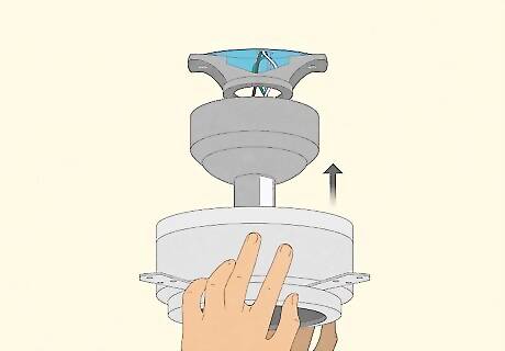Carefully hang the fan on the hook portion of the ceiling bracket. Use a ladder to carefully lift the fan assembly up towards the ceiling. Every fan has a hook or loop on the bracket to suspend the fan just below the ceiling while you connect the wiring. Look on the body of the fan for a small opening that matches the hook and hang your fan on it. In the extremely rare off-chance your fan’s bracket doesn’t have a hook, ask someone else to hold the fan in place while you work.