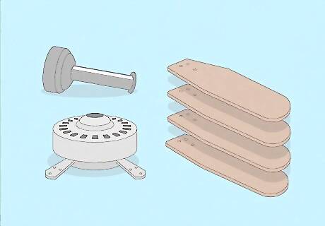 Follow your fan’s manual to assemble as much as you can on the ground. Minimize the amount of effort you have to put in on the ceiling by assembling the fan on the ground. Follow your manual’s instructions to connect the base plate, downrod, motor, and switches. Pro-tip: Install half of your fan blades now. The added weight will make it easy to stabilize the fan on the ceiling as you work and you won’t have to do all of the blades after the fan is attached to the ceiling, which can be a pain to do.