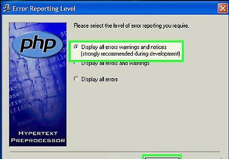 On the next window, make sure that the radio button "Display all errors warnings and notices" is clicked. Then click "Next>".