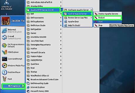 On the Windows taskbar click "Start">"All Programs">"Apache HTTP Server">"Control Apache Server">"Restart". This should restart the Apache server. Now we need to create a test PHP to see if everything is working.